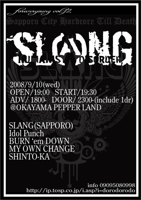 foreveryoung vol.12 SLANG 「THE IMMORTAL SIN」 RELEASE TOUR 9/10(wed)at PEPPER LAND start/19:30 ticket/ADV\1800- DOOR\2300-(1drink込) cast SLANG(札幌) MY OWN CHANGE(津山) Idol Punch shinto-ka BURN 'em DOWN