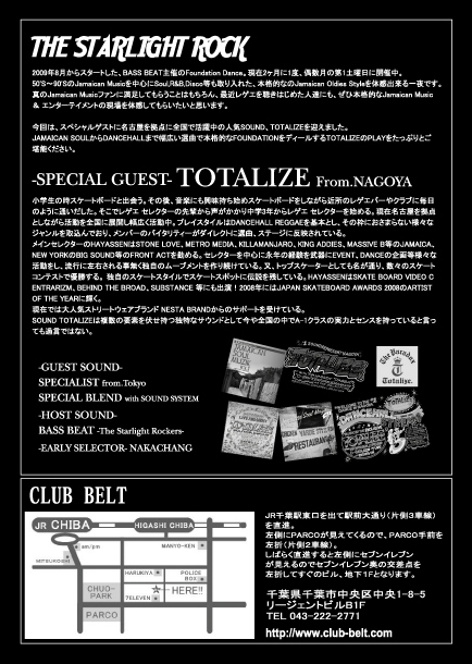 2009年8月からスタートした、BASS BEAT主催のFoundation Dance。 50'S〜90'SのJamaican Musicを中心にSoul,R&B,Disco等も取り入れた、本格的なJamaican Oldies Styleを体感出来る一夜です。