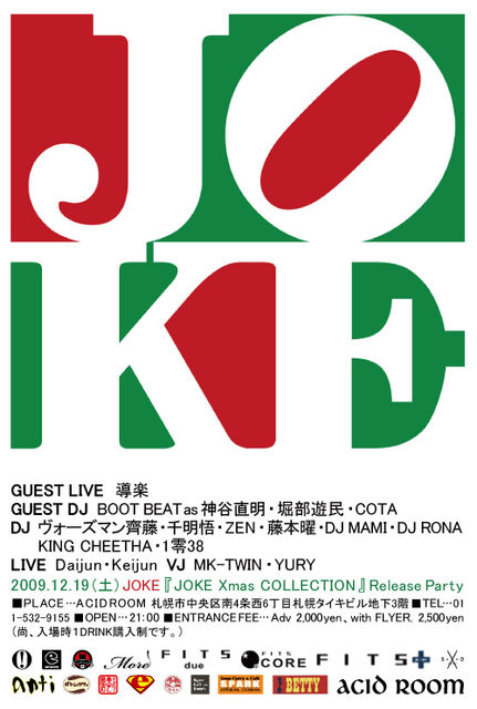 ■JOKE■ - JOKE Xmas Collection Release Party in SAPPORO - 【日程】12/19(土) 【場所】ACID ROOM http://www.acidroom.jp/ 【時間】21:00〜ALL NIGHT 【料金】Adv:2000yen w/f:2500yen ※全て入場時1ドリンク購入制です。 20才未満の方はご入場いただけません。ご入場の際、IDのご確認をさせていただきます。
