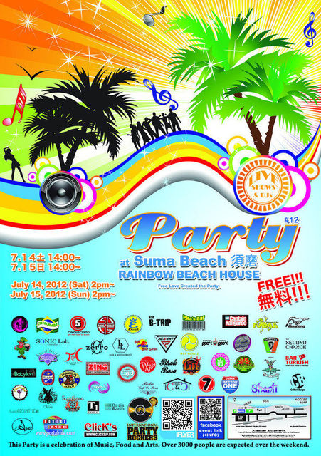 須磨海岸の大規模パーティでノーチャージ "The Party is a celebration of music, food, and arts. Over 3000 people are expected over the weekend." 毎年夏、須磨海岸にて3000人オーバーで盛り上がっている。