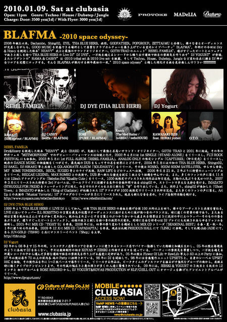 ◆2008年誕生以来、Dachambo、Shing02、EYE、THA BLUE HERB、旅団、GODFATHER、POPGROUP、ZETTAI-MUと共催し、様々な音とオーディエンスが交差しながらも、GOOD MUSICを実感できる場所として異質なクラブカルチャーを築き上げている室内レイブパーティ”BLAFMA”。年明けの今回はDry&Heavyを脱退した秋本”HEAVY”武士と最強のサウンドオリジネイター、GOTH-TRADのユニット”REBEL FAMILIA”、選びすぐったビートとエフェクトで抜きと刺しを持つTHA BLUE HERBのLive DJ”DJ DYE”、一万枚を越えるレコードから繰り出す選曲で独自の雰囲気を作り出す”DJ YOGURT”が登場。またレジデントの”RAMA & CASHY”は-2010 tribal set & 2010 live set-を披露。そしてTechno、House、Dubstep、Jungleなど変幻自在に操るDJ陣が全フロアを完璧にロックする。そんなBLAFMAが敢行する新年最初の一夜。”2010 space odyssey”と題した深化する旅を是非楽しんで下さい!!!!!!!!!!!!!!!!!!