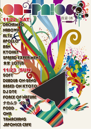 初日は今年の京都発で最も全国に名を轟かせ、破格の快進撃を続けたNabowaを発信したレーベル[bud/mogie]プロデュースにより、今年の朝霧JAMでも大トリの大役を果たした、今や各地のフェスなどで最もエキサイティングなフロアを現出させるお祭りバンド「Dachambo」、ヤバいパーティーにはもはや欠かせない関西が宇宙に誇る奇人「ALTZ」、日本中のパーティアニマルから絶大な支持を得るパーティ「eleven.」を主宰する「Apollo」、そしてもちろん2008年度MVPの大衆音楽団「Nabowa」ら錚々たるメンバーがお送りする一夜! そして二日目は、こちらも京都屈指のカルチャースポットとして常に面白い事を発信し、全国より賞賛を浴びる、まさに"音楽カルチャーの人間交差点"[JAPONICA music store]プロデュースナイト!新たな試みとして待望のJAPONICAレーベルを立ち上げ、早くも評判を呼んでいる中、そのリリース第一弾アーティスト、あの坂田明氏の実子であり、元ポラリスにしてUAやハナレグミなどで強烈なリズムを生み出すスーパードラマー「坂田学」と京都アンダーグラウンド・シーンの顔役「マロン」の二人によるスーパーユニット「dubdub on-seng」、そしてこちらも<JAPONICA recordings>より待望のライヴアルバムがリリースされた、京都が世界に、いや宇宙に誇る至宝「SOFT」が揃い踏み!!更に全国ツアーを終えたばかりのTHA BLUE HERBから、BOSSの右腕「DJ DYE」、コズミック・ディスコ・シーンの日本代表、KZA、DJ KENTによる「FORCE OF NATURE」を豪華に大フィーチャー!!更に更にパワースポットJAPONICAの磁場に引き寄せられた強力な面々がメトロとetwの両会場に大集結!2日間に渡り壮大なヴァイブレーションを巻き起こす、まさにフリーフォーム音楽の祝祭!
