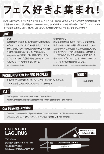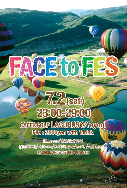 FACE to FESはフェスが好きな人たち同士や、 これからフェスに行ってみたい人たちが交流できる時間を演出する音楽イベントです。 頂、朝霧jam、GREENROOMなどのゆる系フェスの音楽を中心に、 ライブ、ファッションショーの企画も用意してます。 夏フェス前にぜひフェス仲間を増やしてみてはいかがでしょうか!?