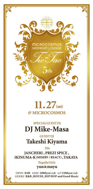多くのメディアで取り上げられる話題のカフェラウンジ渋谷MICROCOSMOS.そこで週末を中心に開催されるMICROCOSMOS MIDNIGHT DJ LOUNGE.その中で、毎回多くのオーディエンスから大反響を呼び今やMIDNIGHT LOUNGEイチ押しのパーティーとなったTic-Tac、そしてその期待に応えspecial guest djにはビックセールスを記録したMIX CD『Extra R&B』等で知られ名実ともにR&Bシーン若手NO.1のDJ Mike-Masaが登場!!今回はGuest djとしてDJ&オーガナイザーとして都内各地で活躍するTakeshi Kiyamaも参戦!他にも都内各地で活躍する多彩なDJ陣、さらにはTequila Girlsも加わりさらに熱い一夜になることは間違いないだろう!