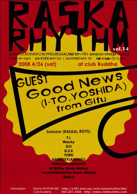 SKA , ROCKSTEADY等60〜70's Jamaican vintage muzik を中心に開催する RASKA RHYTHM。 今年2発目はG.W.突入スペシャル!! ゲストに岐阜のB's Cafeで毎月第一火曜に開催中のGOOD NEWS CREWが登場です。 ジャマイカンミュージックを時に熱く、時にゆったりと聴かせてくれる彼らの選曲は要チェック! また2周年を大盛況でさらに自信をつけたRASKAL BOYS のセレクトもフロアを沸かせます! ということでG.W.初日の夜は是非RASKA RHYTHM でお過ごし下さい! We want to enjoy many audiences with great jamaican muzik!!