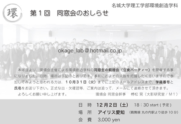 開催終了第1回 環境創造学科 同窓会のおしらせ