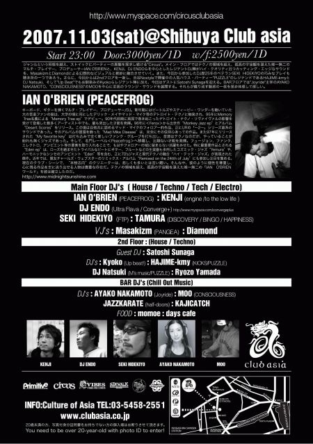 IAN O'BRIEN (PEACEFROG) キーボード、ギターを弾くマルチ・プレイヤー、プロデューサー/DJ。青年期にはビートルズやスティービー・ワンダーを聴いていた大の音楽ファンの彼は、大学の頃に耳にしたデリック・メイやマッド・マイク等のデトロイト・テクノに触発され、95年にMemory Tree名義による“Memory Tree ep”でデビュー。90年代前期に英国で巻き起こったデトロイト・テクノ・リヴァイヴァルの影響を受けて登場した数多くアーティスト中でも、最も突出した才能を発揮。96年に<Ferox>から出世作“Monkey Jazz ep”とアルバム“Desert Scores”をリリース。この頃は自他共に認めるマッド・マイクのフォロアー的作品、正にURの「〜2〜」シリーズ直系のサウンドであった。そのアルバムの冒頭を飾った“Mad Mike Disease”は、完全にその信仰心あっての作品。また97年にリリースされた“My favorite key”は打ち込みで全く新しいファンク・グルーブを打ち出し、音源はテクノなのだが、やっていることが紛れも無くジャズであった。そして、名門レーベル<Peacefrog>へ移籍し、比類ない才能を発揮。フュージョン、ファンク、エレクトロ、アンビエント等の要素を取り入れることで、もはやフォロアーの域に留まらない活躍をみせた。特に最重要作品とされる“Eden ep”は、ローズを絡ませたトライバルなビートにギター、フルートなどの生楽器も多用したコズミック・ジャズ“Yemura”や、ハーモニックなシンセのアンビエント“Eden”等を含む、正に70'sジャズと現代テクノの融合「ハイ・テック・ジャズ」が表現された傑作。近年では、盟友チャールズ・ウェブスターのリミックス・アルバム“Remixed on the 24tth of July”にも参加し注目を集める。現在のクラブ・シーンで、“本物志向”のクリエーターは、悲しくも多いとは言い難い。そんな中、彼のように個性を尊重し、心に残る作品を世に送り出せる人物は貴重な存在だ。テクノの領域を超え、孤高の宇宙観を湛えた唯一無二の「IAN O'BRIEN ワールド」を彼は確立したのだ。 http://www.midnightsunshine.com/