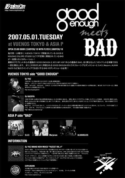 毎月第1火曜日にVUENOS-TOKYOで開催されている『GOOD ENOUGH』とCOLORS STUDIOなどで不定期に開催されている『BAD』が一夜限りのコラボレーション!! 最新のクラブヒット中心の選曲の『GOOD ENOUGH』と90'S HIP HOP 中心の選曲の『BAD』、全く異なるふたつのイベントを体験できる一夜を演出します。またこの日のために用意される『GOOD ENOUGH』のエクスクルーシブなダンスショーとS.A.S、Marjorm、ALKAHOLICSなど強力ラインナップでお送りする『BAD』のダンスショーは必見!!