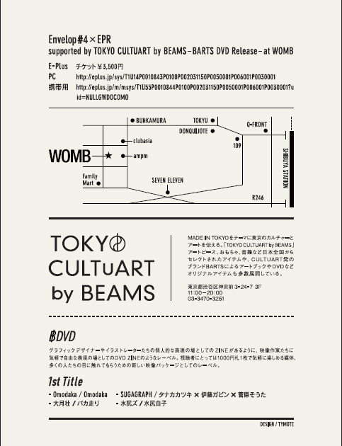 あと今回はBEAMSが新しく立ち上げたDVDレーベルのBARTS DVD Release Partyのリリースも兼ねていますので映像も超協力です。VJには5年ぶりの激レアVJのPOWER GRAPHIXXにタナカカツキ率いるVJ QUIZにそして今注目のTYMOTE、bysexual team(田中廣太郎) さん、NoiseElementと超豪華ゲストをご用意いたしました。