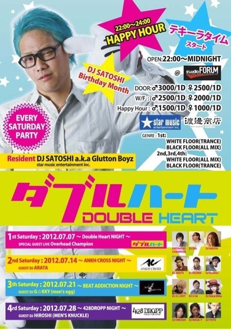 開催日 : Every Saturday Open : 22:00 会場 : studio FORUM Genre : 1st : WHITE FLOOR (TRANCE) : BLACK FLOOR (ALL MIX) 3rd / 2nd / 4th : WHITE FLOOR (ALL MIX) : BLACK FLOOR(TRANCE) Door : Men 3,000yen / 1D Women 2,500yen / 1D W/F : Men 2,500yen / 1D Women 2,000yen / 1D HAPPY HOUR (22:00~24:00) : Men 1500 / 1D Women 1000 / 1D