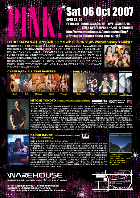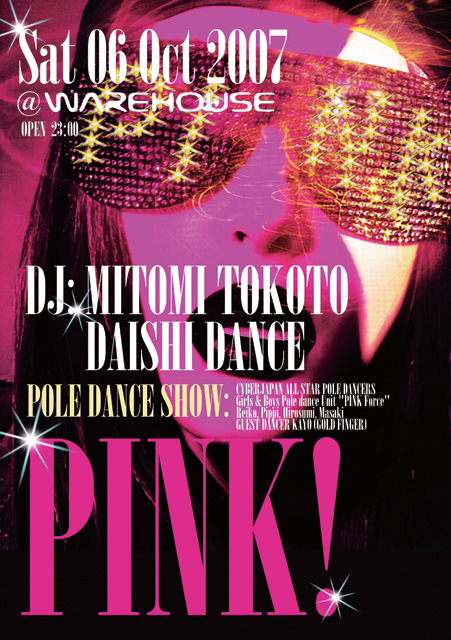 《DJ》 DJ: MITOMI TOKOTO. DAISHI DANCE. POLE DANCE SHOW: CYBERJAPAN ALL STAR POLE DANCERS Khiri, Masayo, Rei, Kumi, Takako(misty). Girls & Boys Pole dance Unit "PINK FORCE" Reiko, Pippi, Hirosumi, Masaki GUEST DANCER KAYO (from GOLD FINGER)