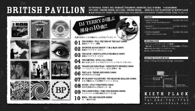 01:THE KINKS/TILL THE END OF THE DAY(1966) 最高のパーティー賛歌 02:SPENCER DAVIS GROUP/I'M A MAN(1967) 最強のフロアキラーその1 03:THE QUIK/BERT'S APPLE CRUMBLE(1967) 最強のフロアキラーその2 04:THE SMITHS/STILL ILL(1984) 後にも先のにもザ・スミスほどロマンティックなバンドはいない 05:TRASH CAN SINATRAS/OBSCURITY KNOCKKS(1990) ハートにグッとくるメロディー。まさに青春の一曲 06:THE LA'S/THERE SHE GOES(1990) 90年代英国が生んだ大名曲 07:MY BLOODY VALENTINE/YOU MADE ME REALISE(1988) まるで魔法のような空間がクリエイトされる 08:SUEDE/STAY TOGETHER(1994) 90年代英国が生んだ神がかった一曲 09:THE LIBERTINES/TIME FOR HEROES(2002) ロックンロールの夢を復活させてくれた曲 10:MIKA/WE ARE GOLDEN(2009) 今、一番好きな曲