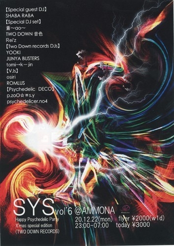 ▼YOOKI▼(Two Down Records) 某神戸RAVEイベントで最高の賛辞を受け,大阪、神戸、京都で活躍するPsychedelic Trance DJ。このDJの手にかかれば、全オーディエンスを別世界に連れて行ってくれるであろう!!! 10月にも行われたS.Y.S.でのプレイでも、フロアは最高潮に盛りあげた!今後、要 チェックのDJ。