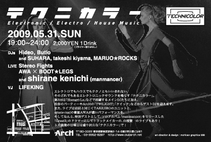 「テクニカラー」vol.3 09.05.31(SUN)19:00-24:00 at Club ArcH FEE:2000YEN(1drink) DJs:HIDEO,Butio and SUHARA,takeshi kiyama,MARUO★ROCKS LIVE:STEREO FIGHTS,AWA×BOOT★LEGS Special LIVE:Shirane Kenicihi(manmancer) VJ:LIFEKING