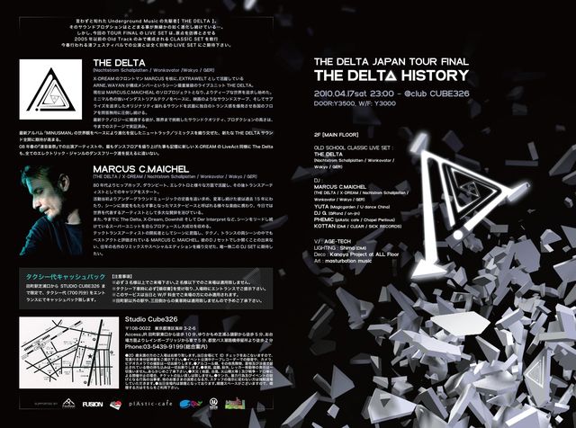 DATE : 4月17日(土) 23:30〜 VENUE : CUBE326 ALL FLOOR DOOR : Y3,500- W/F : Y3,000- GENRE : Techno , Tech House , Minimal , Tech Trance , Progressive LINE UP : THE DELTA , MARCUS C.MAICHEL , FUSION FRIENDS , & more DJ's & Artist