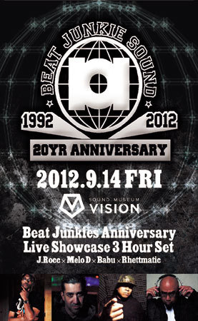 90年代ヒップホップ・シーンの中で、Invisibl Skratch Piklz、X-Ecutionersなどと共にターンテーブリズムの頂点を極めたウェストコーストを代表するターンテーブリスト・クルー、The Beat Junkies、またの名を“The World Famous Beat Junkies”。その中心メンバーであるJ.Rocc、Babu、Rhettmatic、Melo Dが、約10年ぶりに4人全員が揃って来日を果たす。今年、結成20周年を迎えた彼らは、6月末にLAにて記念イベント『The Beat Junkies 20 Year Anniversary』を開催。そのショウでも大反響となった4人でのチームルーティンの他、今回の来日ツアーではそれぞれのソロ・プレイやデュオでのセッションも展開する。DJ BAKUやDJ KOCO a.k.a. SHIMOKITAなど、国内の実力派DJも駆けつけるこの日。The Beat Junkiesの20年間の軌跡が再現されるとともに、また新たな奇跡が誕生する。