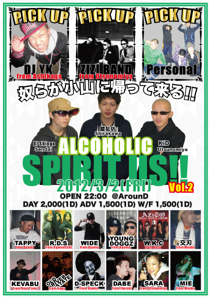 ALCOHOLICって?SPIRIT USって?と思うあなた、ここに来れば全て分かります!!知らなくてもこの日、是非このイベントに来て覚えて下さい(^-^)後悔はさせません!!