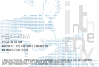 ここ数年のディープハウスシーンで最も支持を受けている、最重要コアレーベル&プロジェクト"NEEDS"がin the mixに登場!これまで、数多くの旬のゲストDJをブッキングし続けるin the mixが今回選んだDJは、NEEDSのLars(ラース)。ジャズから多大な影響を受ける彼のスペシャルなDJスタイルは必見。そしてドープジャズシーンへ傾倒するDJ MOCHIZUKIのプレイも見逃せない。ジャジーそしてハウシーな、夏の終わりに相応しい印象的なディープパーティーを御堪能ください。