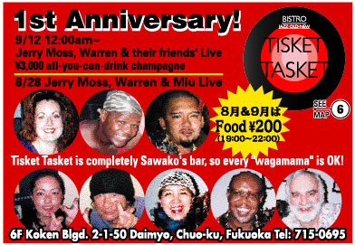 日時:2004年9月12日0時から(11日からだらだら飲んでてもオッケイ) 場所:TISKET−TASKET 福岡市中央区大名二丁目1−50公建ビル6F 料金:3000円でシャンパン飲み放題+ライブ TEL:092−715−0695