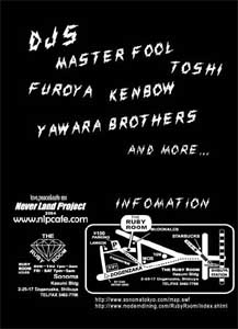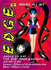 「EDGE01」 9/25(sat) 22:00→5:00 House, All mix THE RUBY ROOM @渋谷 tel:03-3780-3022 http://www.sonomatokyo.com/map.swf http://www.moderndining.com/RubyRoom/index.shtml djs:master fool, toshi, furoya, kenbow, YAWARA brothers and more... 前売:\1500 w/1drink +welcome shot 当日:\1500 w/1drink info:http://www.nlpcafe.com/ わかりやすい音楽をわかりやすいスタイルで。 とにかくこだわりなく楽しめる空間を目指します。 このイベントは今回が1発目。 内輪っぽい雰囲気は一切なさゲ、