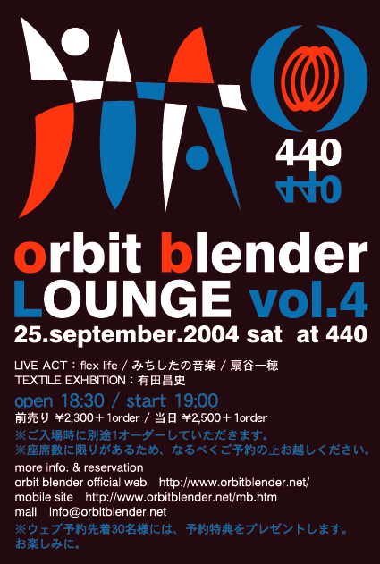 @440 http://www.club251.co.jp/440/ -------------------------------------------------- LIVE ACT: flex life http://www.ldandk.com/flexlife/flex.html みちしたの音楽 http://members.at.infoseek.co.jp/michion/ 扇谷一穂 http://www.oogiyakazuho.com/ TEXTILE EXHIBITION:有田昌史 http://www.epoch-arita.com/ 18:30open/19:00start 前売り 2,300円+1order / 当日 2,500円+1order ※ご入場時に別途1オーダーしていただきます。 ※座席数に限りがあるため、なるべくご予約の上お越しください。 ※前売りチ
