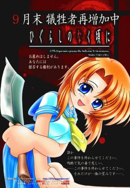 ひぐらしのなく頃に の次回再版のためのCD-ROM納品日が決定しました。 早いお店ではこの日に早速頒布が開始されるかと思います。 また、店張りのポスター、配布のチラシも第2版として別絵柄で登場します。 なお。この情報は mixi 以外には出ていませんので、このコミュニティの人だけが知っている情報になります。