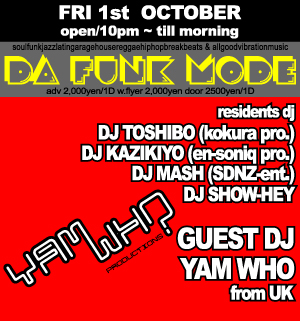 [ DA FUNK MODE ] Vol.6 10/1(Fri) @Club Strawberry 22:00pm〜Chill Morning ★adv:\2,000/1D ★w.flyer:\2,000 ★door:\2,500/1D http://sdnz-ent.com/dfm/ HIPHOP/SOUL/FUNK/JAZZ/HOUSEを中心に、良質のBLACKNESS SOUNDをテーマに進み続ける'DA FUNK MODE' 5月に、DJ MITSU THE BEAT、8月にDJ KIYOとゲストを招き、衝撃のワンナイトを演出し続けるDA FUNK MODEに、今月は数々の大物アーティストのREMIXを手掛け、ALBUMのリリースも待ち遠しいYAMWHOがゲストDJとして、UKより来襲!! 少し畑違いかもしれませんが、BLACK MUSICがお好き