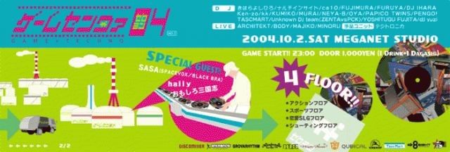 さぁ!!君もゲームセンタァに夢冒険しに来ないかぃ? ■□■□■□■□■□■□■□■□■□■□■□■□■□■□■□■□ ゲームセンタァ 04(ゼロヨン) 2004/10/02(SAT) at MEGANET STUDIO START 23:00~ 1000yen1Drink+1Dagashi & 踊り放題・GAMEし放題 GUEST DJ SASA(とらやんけ) GUEST LIVE おもしろ三国志(蜀) HALLY(ファミコン) DJ ca10 きはらよしひろ MURAI FUJIMURA OYA KUMIKO UnknownDJteam Tascmart PAPICO TWINS FURUYA Ken-Zo ナルチインサイド PENGO! dj yuzi