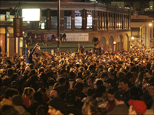 いよいよです! 集合:5時@レッドライン・チャールズMGH駅を出たところ 写真は第一回が開催された日、まさかの3連敗の後の4連勝で宿敵ヤンキースを下しリーグチャンピオンになった直後の、レストランUNOの前、フェンウェイ球場周辺の様子です。