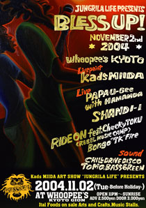 Kads MIIDA Art Show "JUNGRILA LIFE" Presents BLESS UP! 2004.11/02(Tue文化の日前日) @Whoopee's(京都) 京都出身で、日本を代表するイラストレーター、"Kads MIIDA"の京都初の個展 "JUNGRILA LIFE"を記念し、豪華キャストによる、アートとサウンドのコラボレーションイベント! -SPECIAL LIVE PAINT- Kads MIIDA ( http://kads.net/ ) -LIVE- PAPA U-Gee with HAMAMDA ( http://zionhigh.net/ ) SHANDI-I ( http://shandi.co.tv/ ) RIDE ON a.k.a. ROTTEN RANKS feat. Chucky TOKU, BONO"TK"FIRE CHILL DRIVE DISCO( http://www.chilld