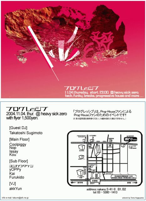 プログレ祭り!!!! プログレ好きならこなきゃ損2(゜∀゜)b 2004/11/04 [プログレッシブ]@中野 Havey shic Zero Open 23:00 Fee 1D/1500 Guest Dj Takatosi sugimoto Dj's coolpiggy NOP lssay Kou ヨシカワタケシ yOPPy Kai Furukido ↓ディスはこちらまで↓ http://mixi.jp/show_friend.pl?id=119731