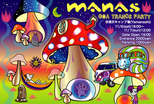 もう野外の季節も終わりですがManasは 懲りずにまだやります。 あいかわらず曲げ曲げの泣き泣きです。 今年の野外の〆にどうぞ。 Manas presents GOA TRANCE PARTY晩秋 Date : 11/6-7 Place:滑沢キャンプ場(山梨) Gate 2000 yen / Parking 1000 yen <Live> Gokufuto,Saikariom <Guest DJ> Kemix (Psychedelik16/Earthcore Japan/AU) Pedro (Psychedelik16/AU) <DJ> Batta Ken-Ken Mario Gen Take <VJ> Kan chan <Deco&Flyer> TivaTiva(tivativa.net) <Web / Map> http://www.sfaira.net/manas/