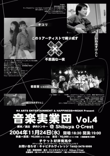K4 ARTS ENTERTAINMENT & HAPPINESS∞NOAH Presents 『音楽実業団 Vol.4』 脚本/演出 伊丹ドンキー 2004年11月24日(水)@渋谷O-Crest 開場 18:30 開演 19:00 料金 前売¥2,500 / 当日¥3,000(共にドリンク別) ※整理券入場制 −出演アーティスト− チコリ 都森家 いわみずけんじ MC:いわみずけんじ 主催:音楽実業団 協力:?キャピタルヴィレッジ Shibuya O-Crest 企画制作:(有)K4 ARTS ENTERTAINMENT (株)HAPPINESS∞NOAH 朗読劇で涙と笑いの絶妙なバラン