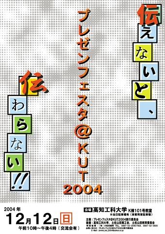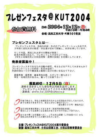 高知大学の企画として始まった『プレゼンフェスタ』が 工科大で12月12日(日)に開催されます! プレゼンフェスタをご存じでない方は、以下の説明をご覧下さい! ━━━━━━━━━━━━━━━━━━━━━━━━━━━━━━━━━━━━ ■ プレゼンフェスタ@KUT2004 ■ ■ << 伝えないと、伝わらない!! >> ■ ━━━━━━━━━━━━━━━━━━━━━━━━━━━━━━━━━━━━ 主 催:プレゼンフェスタ@KUT2004実行委員会 後