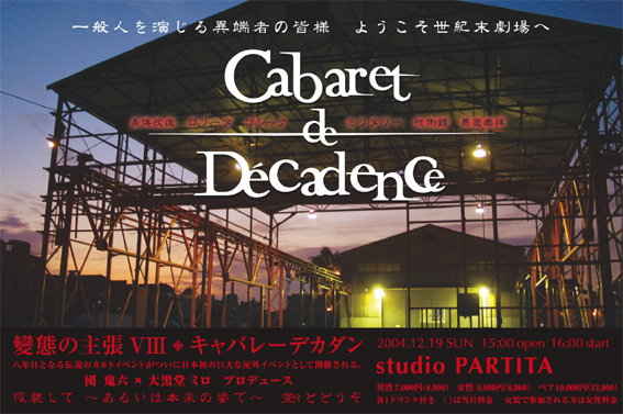 今年で第8回目となる伝説のカルトEventがついに日本発の巨大な屋外イベントとして開催される。 :団 鬼六 × 大黒堂ミロ Produce: 【キャバレーデカダン】 【映画的虚構】 【混沌の錬金術】 【世紀末劇場】 【会員制限二次会】 ・DRESSCODE・ 仮装して 〜あるいは本来の姿で〜 堂々とどうぞ 貴方の中の”架空の退廃的キャバレー”の客・ホステス・給仕 etc...をイメージする服装、あるいはフェティッシュな装いでの参加をお待ちしております。 身体改造 ロリータ ゴシック ミリタリー 性倒錯 悪魔崇拝 前