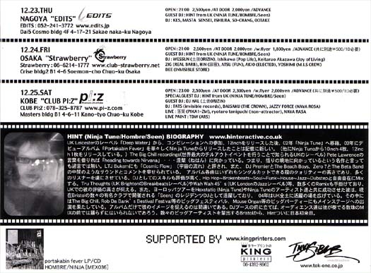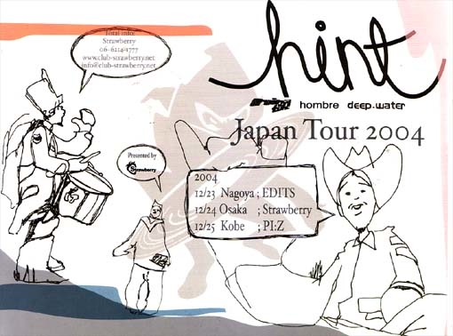 12/24大阪ミナミStrawberry (www.club-strawberry.net)にて、 HINT (Ninja Tune/hombre/Seen) www.hinteractive.co.ukのJapan Tourを開催します。待望の初来日であり、今回は、DJとしての出演で、3hours long setでお送り致します。1st LP ''Portakabin Fever''とはまた違った彼の懐の深いMIXが聞けることが楽しみです。他公演は、12/23(木)@名古屋CLUB EDITS 12/25(土)@神戸CLUB PI:Zとなっております。是非遊びに来て下さい。