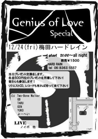 2004.12.24@梅田 Hard Rain(06-6363-5557) 21:00start〜all night! ticket adv 1500yen LIVE ザ・ノイローゼボウリングセンターズ and more... DJs Two−Bone Walker GB TARU GEN YUKO よーへい *当日プレゼント交換などを催したいと思います☆ 各自500円位でプレゼントをご用意して下さい。みなさんも参加します! 他リクエストCD、レコード受け付けます。 聴きたい曲があれば持参お願いいたします。