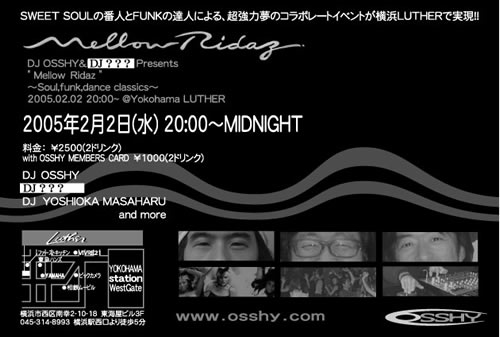 友達が来年2月2日(水)。 休前日でもなんでもない、単なる平日の水曜日に、 横浜LUTHERでダイナマイト級のシークレットイベントを 開催することになりました。 今からカレンダーにマークをつけておいていただくことをお薦めします。 のイベント企画はSOUL、R&Bフリークには絶対 チェックして欲しい内容です。 「DJ OSSHY&DJ●●●● presents MELLOW RIDAZ」 ○は謎だよね! とにもかくにも2月3日は会社有休で!
