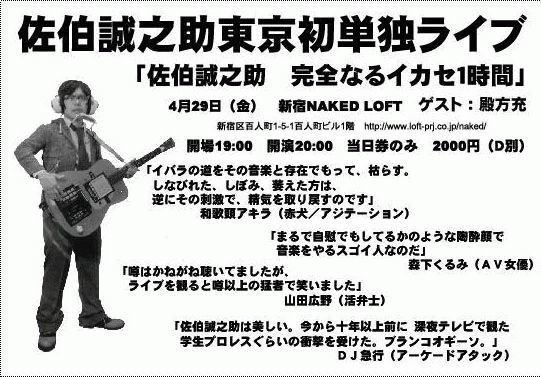 「佐伯誠之助東京初単独ライブ 佐伯誠之助 完全なるイカセ1時間」 新宿 NAKED LOFT http://www.loft-prj.co.jp/naked/ 【出演】佐伯誠之助 【Guest】殿方充、他 Open19:00/Start20:00 \2000(飲食別) ゴールデンウイーク一発目の祝日です! ちょっぴり残業がある人にも優しい時間です。 こんな素敵なイベントで始めてみてはいかがでしょう。