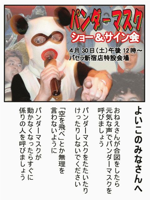 突然ですが、 『パンダーマスク』コミュのオフ会を 開催させていただきます。 単純にアニカラの集いなのですが、 あのパンダーマスクもやってくるという噂が! 現在限定20名で参加者募集中であります。 会費は成り行きですがデイタイムなので 飲み食いして4000円以内というところでしょうか? よろしくお願いいたします。