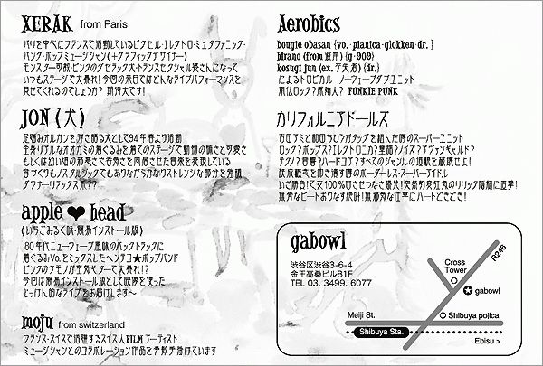パリを中心にフランスで活動しているピクセル・エレクトロ・ ミュタフォニック・パンク・ポップミュージシャン!!! 噂の「XERAK」がついに日本に来日しますよーーー 「ammakashie noka」のmayutanは ーapple head(いちごみるく味・簡易インストール版)ー として出演します ************************************************* 4月28日(木) gabowl@渋谷 19:00〜 gabowlのHP http://www.mugendai.org/gabo/ 出演:XERAK apple head(いちごみるく味・簡易インストール版) Aerobics JON(犬)