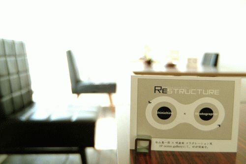 shinichi. × myotographer によるコラボ展 期間 4/1〜4/30 場所 cafe notes gallery (cafe notes 2F) 木曜日定休 福井市花堂南1-9-16 問い合わせ MOv office tel&fax 0778-22-6999 e-mail info@mov-office.com コメント restructure 再構築という意味の言葉である。 一度形を成した物を、あえて壊す。または尊重し利用する。 そうする事で、新しい何かが生まれるのではないか。 明の写