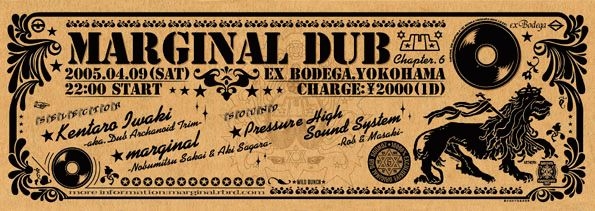 ☆☆☆☆☆☆☆☆☆☆☆☆☆☆☆☆☆☆☆☆ 2005.4.9(Sat) marginal dub chapter 6 @横浜 ex.Bodega start 22:00 ☆SELECTOR☆ KENTARO IWAKI aka DUB ARCHANOID TRIM marginal (NOBUMITSU SAKAI & AKI SAGARA) ★SOUND★ PRESSURE HIGH SOUND SYSTEM ★FOOD★ チヂミ by キムチの由季家 more info:http://marginal.rbrd.com/ ☆☆☆☆☆☆☆☆☆☆☆☆☆☆☆☆☆☆☆☆ こんにちは。marginalのサカイと申します。 僕らが横浜ex.bodegaで偶数月第2土曜日に 開催しているパーティ“marginal dub”の お誘いです。 DEEPかつDU