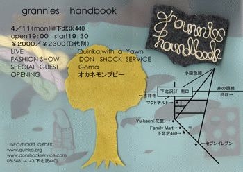 2005/4/11 月曜日 Grannies Handbook おばあちゃんの手帳 場所:下北沢440(03-3422-9440) 時間:open/start 19:00/19:30 チケット:adv./door 2,000yenn/2,300yenn(D別) 演奏:オカネモンプピー/キンカ,with a ヨオン ファッションショー:DON SHOCK SERVICE ゲスト:料理創作ユニット goma VJ:Kenmo2 都内での演奏活動やCOA RECORDS、LD&Kからミニアルバムをリリースしている音楽家キンカ,ウィズアヨオンと、下北沢の隠れ鞄屋DON SHOCK SERVICEによる新しいショーが始まります。 第一回めは、仲良し料理創作ユニットGomaを招いて