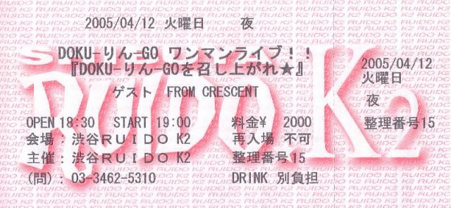 DOKUーりんーGO 1st ワンマンライブ決定! 04月12日 (火) 東京・渋谷 RUIDO K2【http://www.ruido.org/k2/】 『DOKUーりんーGOを召し上がれ!!』 GUEST:FROM CRESCENT open /18:30 start / 19:00 前売り¥2000 / 当日¥2500 (drink別) 当日、DOKU-りん-GO NEWグッズの販売決定しました! DOKUーりんーGO 【http://members.aol.com/Projectkj2004/rin.html】 FROM CRESCENT 【http://www5f.biglobe.ne.jp/~closely/】