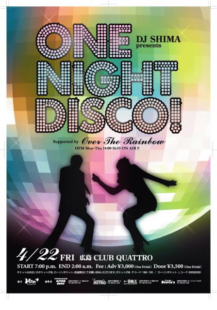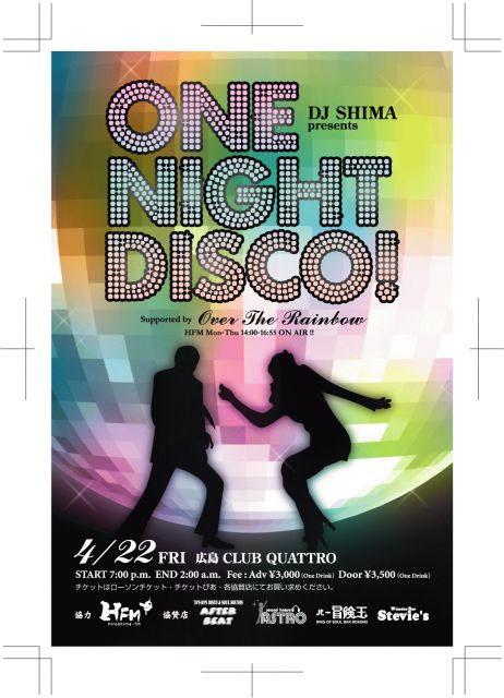 DJ Shima Presents 「ONE NIGHT DISCO」 Supported by「OVER THE RAINBOW」 On HFM http://blog.livedoor.jp/teddy1966/archives/17481692.html 場所 広島クラブクアトロ TEL082-542-2280 公演日 2005年4月22日(金) 開場 ・ 開演 7:00PM〜2:00AM 前売 \3,000 / 当日 \3,500 (税込・1ドリンク付・整理番号 ) 主催PARCO 協力HFM(広島FM放送) 協賛 After beat,Astro,冒険王,Stevie's ついに広島にも、70'S DISCOブームが本当にやってきます。 70’S DISCO DJ“Shima”が送る、今年最大の70'S DISCO PARTYです。