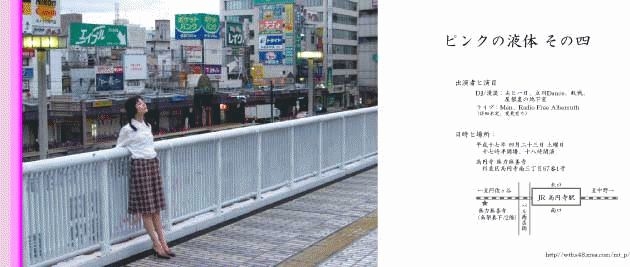 いよいよ4回目となりました。 ■ 出演者と演目 DJ/漫談:あと一日、立川Dance、敗戦、屋根裏の地下室 ライブ:Men (詳細未定、変更有り) ■ 日時と場所: 平成十七年 四月二十三日 土曜日 十七時半開場、十八時開演 高円寺 無力無善寺 杉並区高円寺南三丁目67番1号 pdf版フライヤ http://wtb.s48.xrea.com/tmp/PinkliquidVol4.pdf