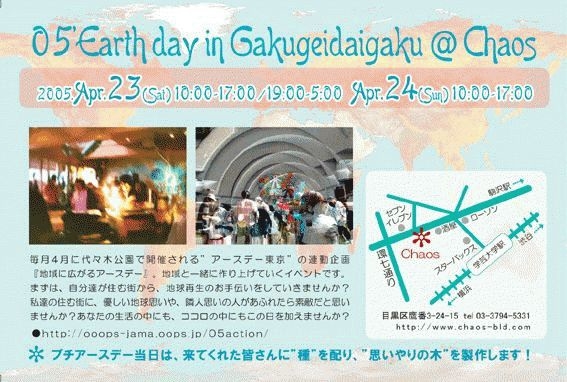 2005年4月23日(土)am10:00-翌am5:00 2005年4月24日(日)am10:00-pm5:00 地域に広がる私たちの街のアースデー 2005'Earth Day in Gakugeidaigaku @Chaos 東横線学芸大学下車徒歩2分 学芸大学Chaos プチアースデーコンセプトは <<ちゃんと地球のことを想う日>> 想うだけでもぜんぜん違う。 想い続けることで行動が変わる。 大きな事はできないけれど 、 小さな事を沢山の人がすることによって 大きな事になる。 些細なことだけど 、元の地球に戻す ささやかなお手伝いをしたいと想っています。