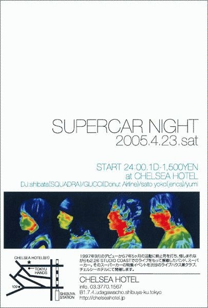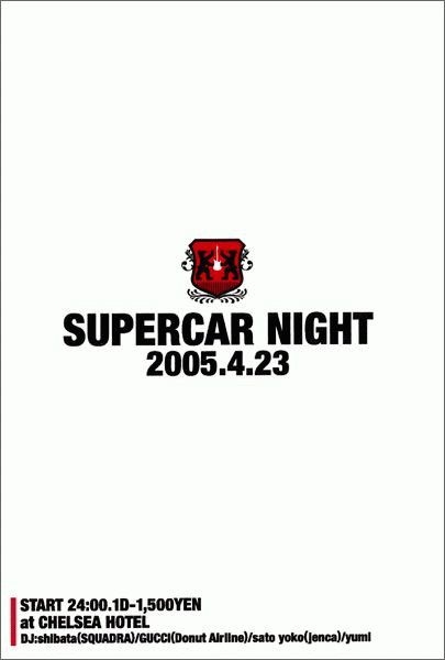 4月23日(土)に渋谷のライブハウス兼クラブ、チェルシーホテルでスーパーカーの曲ばっかりかけまくるイベントをやります。 スーパーカーを好きな人が たくさん集まって騒げるといいですねー。 是非遊びに来てください! [SUPERCAR NIGHT] 2005.4.23(sat) 24:00-29:00 charge:1,500yen(w/1drink) @渋谷CHELSEA HOTEL http://www.chelseahotel.jp DJ: GRV1978(SQUADRA) http://mixi.jp/show_friend.pl?id=4797 すぱ(DONUT AIRLINE) http://mixi.jp/show_friend.pl?id=95260 yoko sato(jenca) yumi http://mixi.jp/sh
