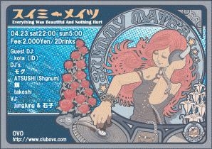 vol3もやっちゃいます! と言う訳で第3回は4月23日に、おなじみ中目黒OVOにて開催します。 今回もサプライズありの楽しいパーティ! 音・踊・酒に塗れるステキな一夜をお楽しみ下さい。 DJ'S 22:00-23:30 よへーい http://mixi.jp/show_friend.pl?id=36806 23:30-01:00 takeshi http://mixi.jp/show_friend.pl?id=27332 01:00-02:30 GuestDJ kota(ID) http://mixi.jp/show_friend.pl?id=175086 02:30-04:00 アツシ http://mixi.jp/show_friend.pl?id=35345 04:00-05:30 もぐピット兄 http://mixi.jp/show_friend.pl?id=136